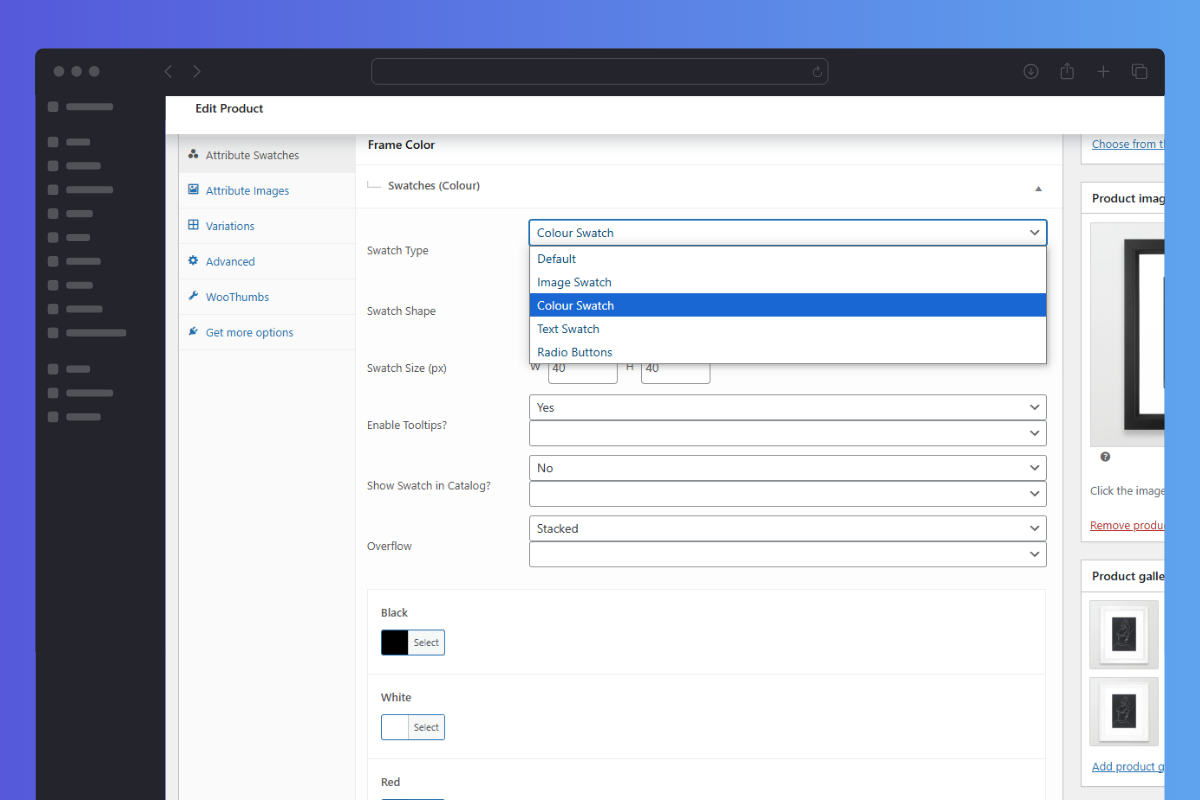 - Add visual color variation swatches to any attribute. Use a hex code, or our user-friendly color picker to get as specific as you’d like